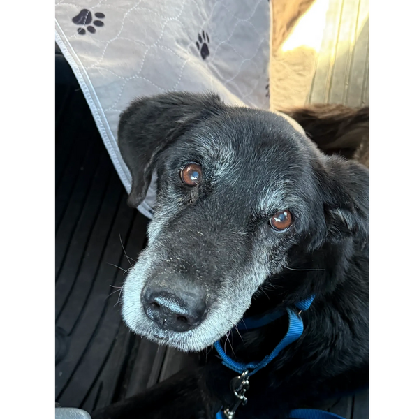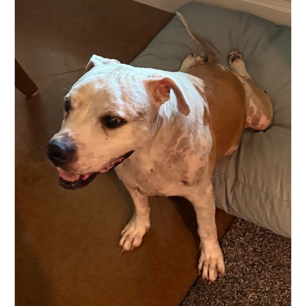 Grace was given up by her owners due to a family tragedy which left her at home for long periods of time. She struggled with incontinence so this made things more difficult. At 14 we felt she still had some life left in her and she joined the sanctuary. She does have a growth under her chin that we suspect is cancer and is losing some muscle mass but she is otherwise healthy. Grace is loving her sanctuary brothers and sisters and can be found napping with one of them throughout the day. If I'm sitting with the dogs she will be cuddled up right next to me and at night she will always make her way right next to me, pushing her body against me. She is the last one to come in from the yard because she likes to explore the whole yard, unless it's cold or rainy when she is quick to do her business and run inside. She is such a sweet and happy girl, tail constantly wagging, and a favorite at the vet.