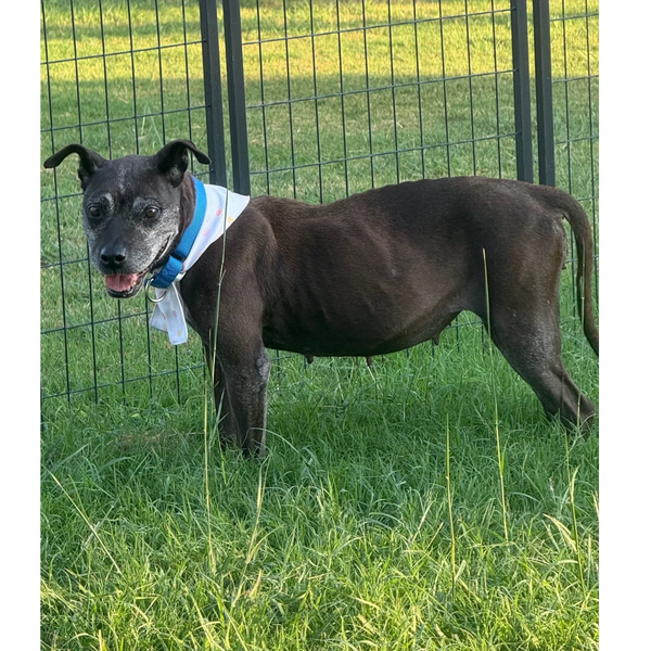 Roger was found as a stray and was in pretty rough shape. He had a ruptured tumor, that turned out to be cancer, along with several hematomas. He prefers to be on his own pillow and not share and doesn't really care about or interact with the other dogs. He is a bit of a whiner when he feels uncomfortable and definitely a barker! He barks at the deer and anyone walking by the sanctuary, although always from afar. He is gently and likes attention. He is a gentle soul and a little meek. He sits and lays down with his legs behind him and has the cutest floppy ears, especially when he's running back to come inside. He likes to explore the whole yard but does not linger and comes in as soon as he's done. He is a sweet boy and I an so happy he found us!